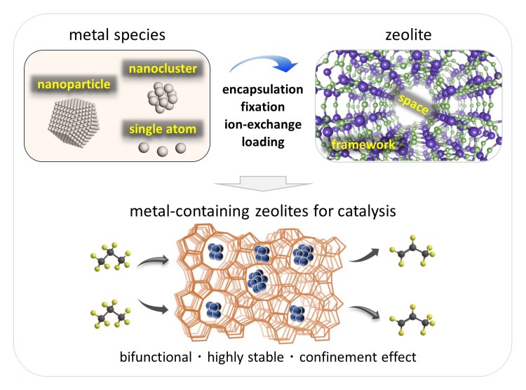 Metal-containing zeolites combine unique shape selectivity and high stability of zeolite with the versatile functionalities of metal species, offering new opportunities to chemical transformations. Optimal performances originate from the synergy between the guest metal species and the host zeolite, which generate geometric and/or electronic effects in the confined space. Our group innovates synthesis routes that can precisely integrate metal species of specific forms into either the framework or the interior space of zeolites. Through both experimental and computational approaches, we seek to elucidate the host-guest interactions and engineer the microenvironments in the confined space toward a rational design of catalyst at the nano scale. We endeavor to synthesize cost-effective and highly stable bifunctional catalysts to advance environmentally-friendly and sustainable chemical processes. The reactions of our interest include the conversion of C1 molecules to value-added chemicals and the dehydrogenation of propane to propylene.